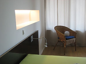 mit einem Schlaufen-Vorhang zum Wohnbereich abgetrennt, Schiebetürschrank, Doppelbett 180×200 Schreibtisch mit Tel und PC- Anschluss, kostenlose Telefonie ins dt. Festnetz