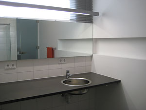 bodenebener, großer Duschbereich / Duschabtrennung aus satiniertem Glas/ WC, Waschtischplatte mit Einbaubecken / große Spiegelflächen / Außenfenster